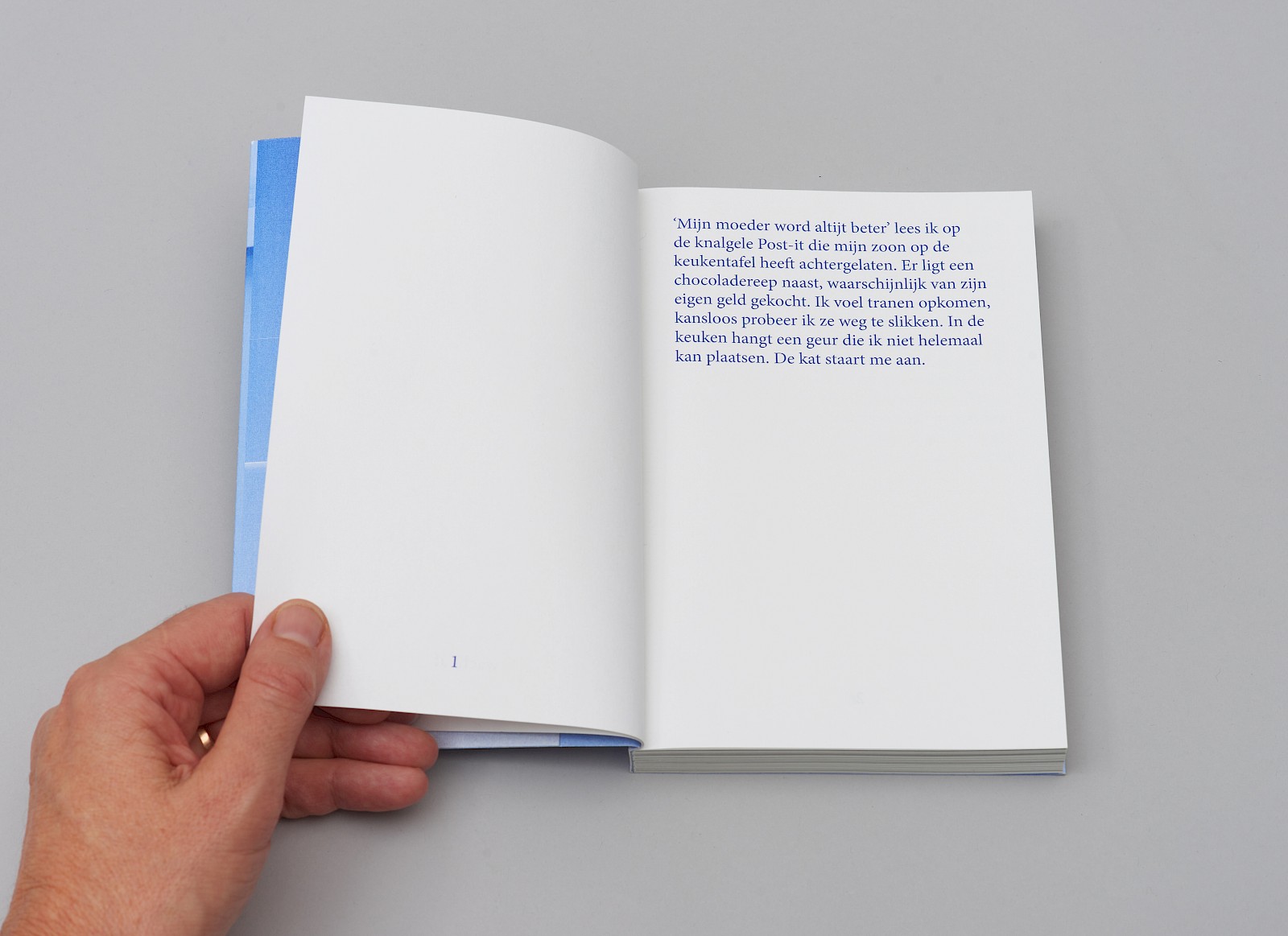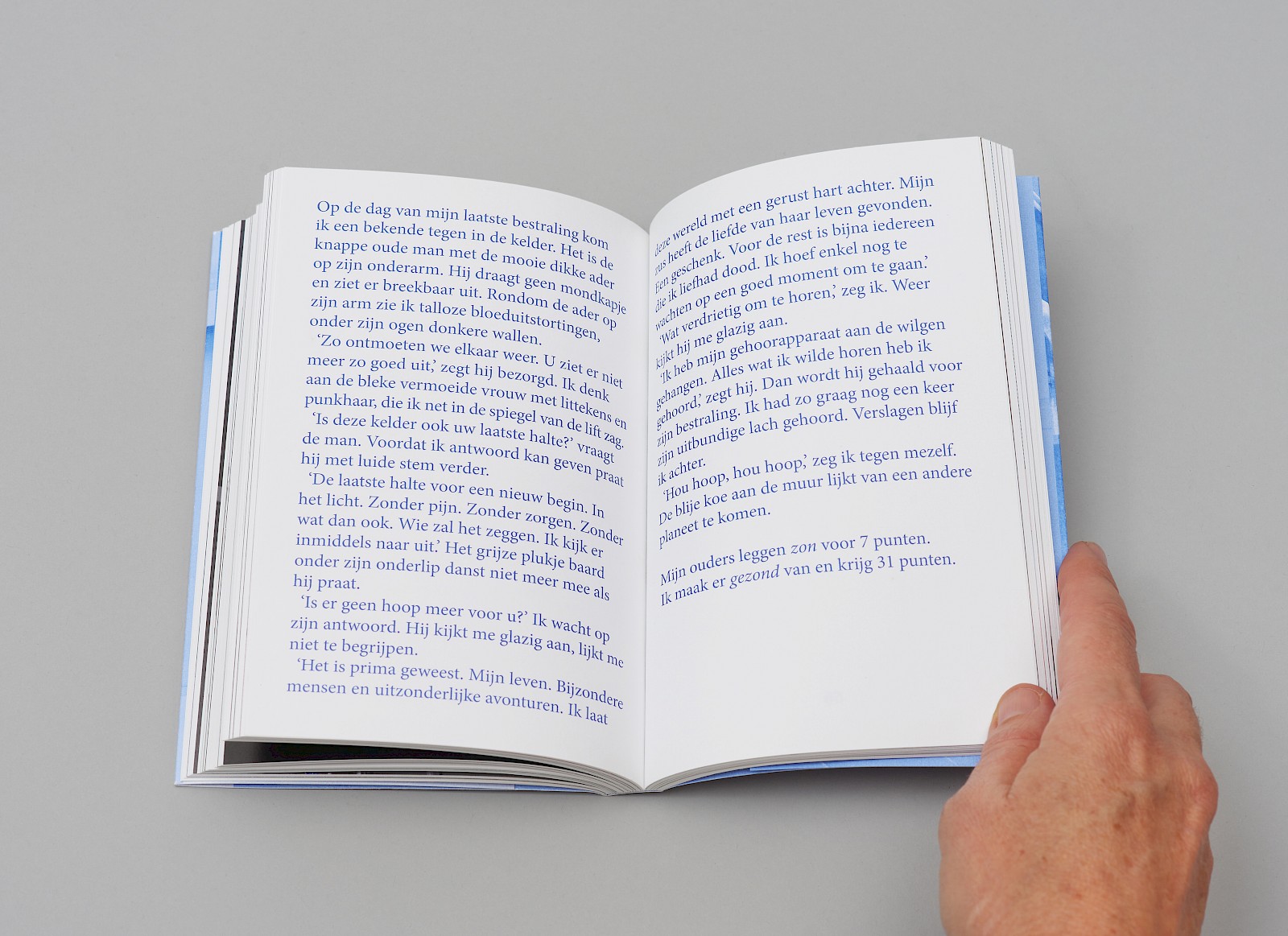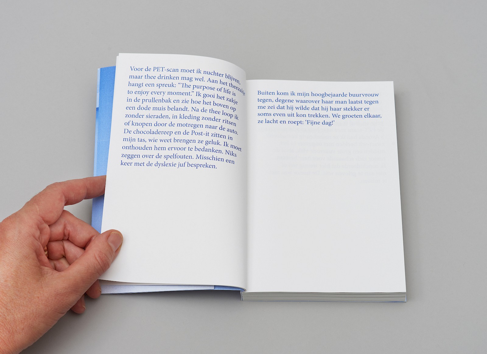 De vertelstem die je deelgenoot maakt van haar gedachten. In een grote blauwe typografie, makkelijk leesbaar wanneer je in de wachtkamer bent of in een bed moet blijven...