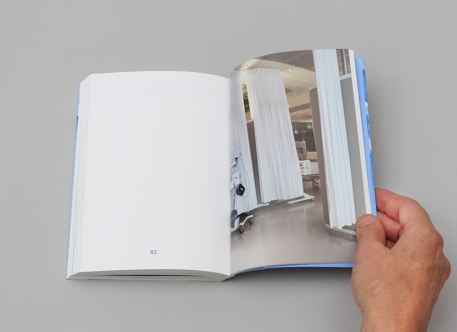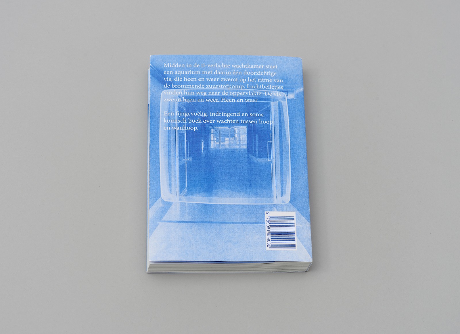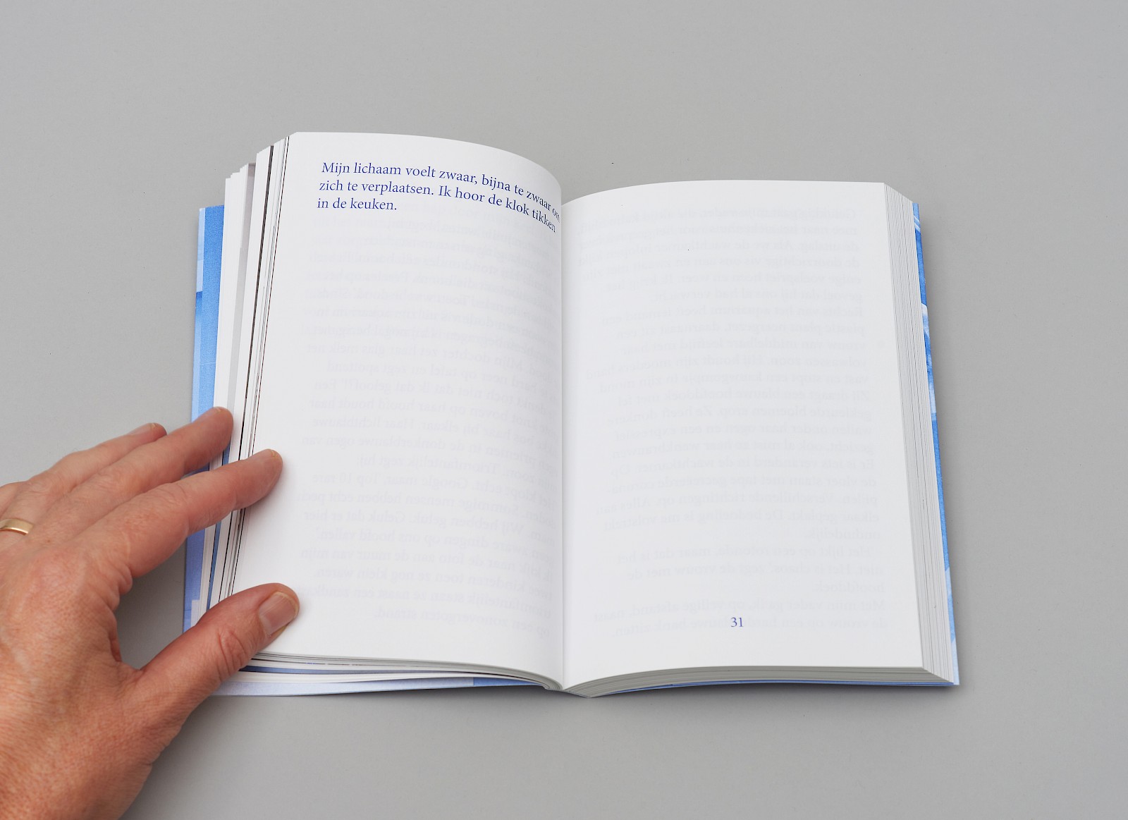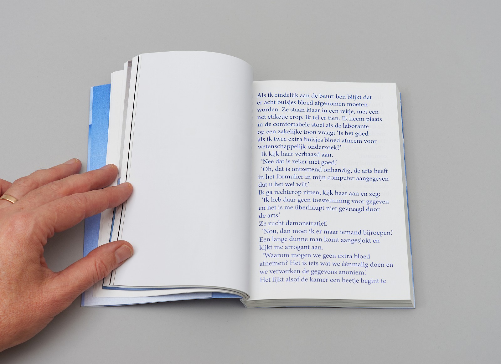 De vertelstem die je deelgenoot maakt van haar gedachten. In een grote blauwe typografie, makkelijk leesbaar wanneer je in de wachtkamer bent of in een bed moet blijven...